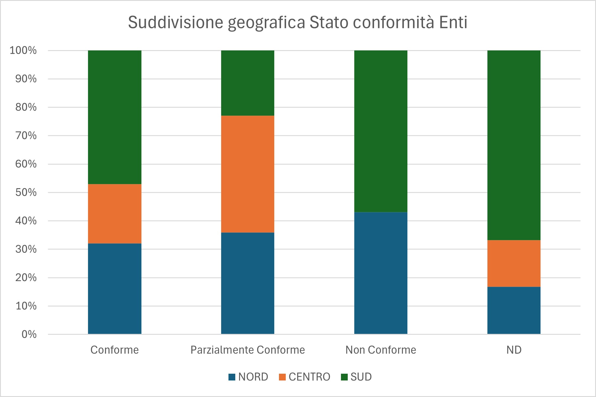 Analizziamo adesso la situazione suddivisa per distribuzione geografica. Il grafico seguente riporta i dati generali sullo stato di conformità suddiviso per Nord-Centro-Sud.